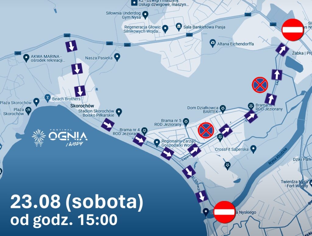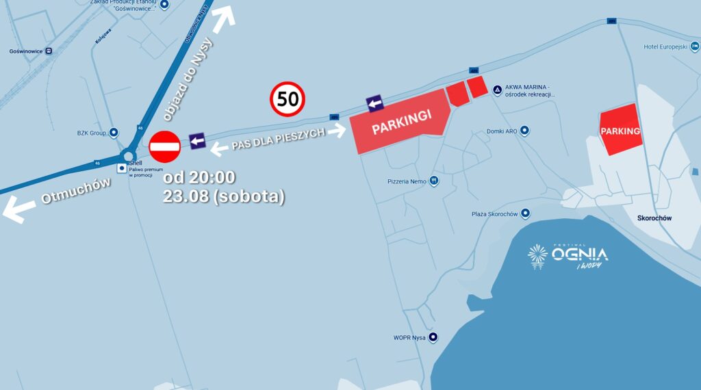 Po 20:00: nie skręcisz na Skorochów – jedź obwodnicą Nysy według znaków na Nysę/parkingi (ruch kierowany objazdem).